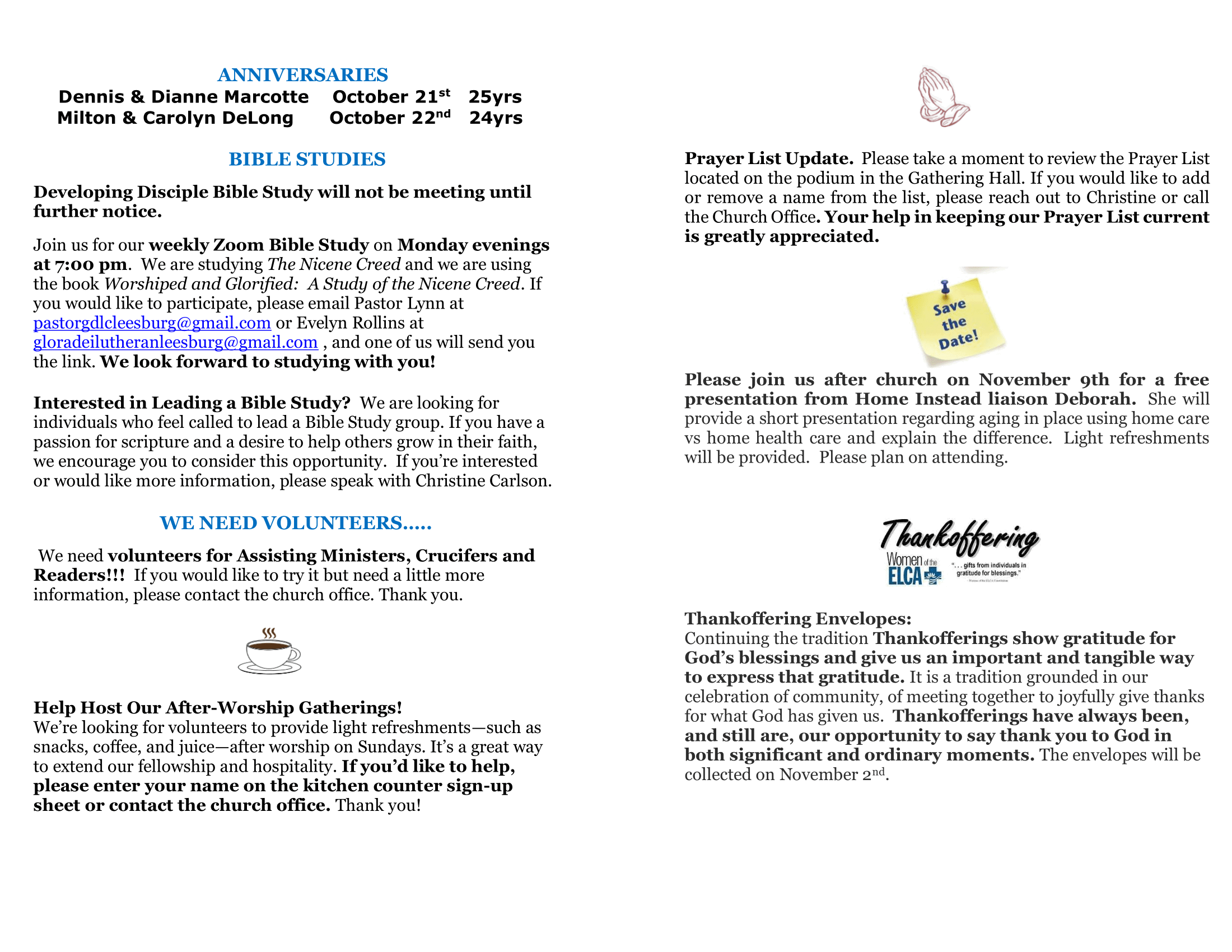 We encourage you to spend time in prayer, listening for how God is calling you to share your blessings. Then, bring your completed card with you to worship on Consecration Sunday, October 19th. Cards will be collected as part of the service. Together, as a community of faith, we will celebrate the many ways God is at work through us and through Gloria Dei. Plan to stay after service for time of Fellowship and some tasty treats. Food will be purchased using Thrivent Choice dollars.