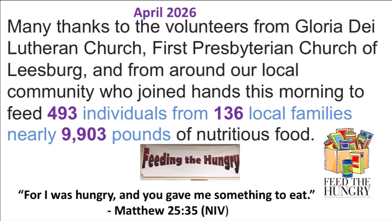 JHIFM was certifed as a 501(c)(3) non-proft public charity on July 20, 2014 and its current Board of Directors consists of six members, three from Gloria Dei Lutheran Church and three from First Presbyterian Church of Leesburg. Each month JHIFM volunteers order, transport, store, bag and distribute canned and packaged food as well as fresh fruit and vegetables that generally last each recipient one week.