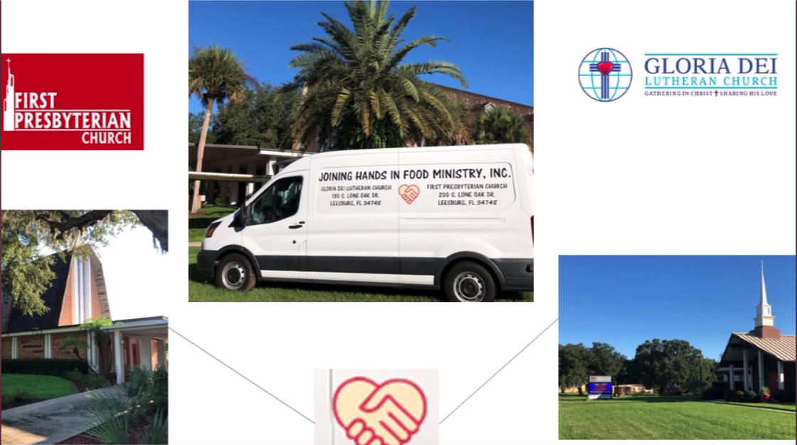 Joining Hands in Food Ministry, Inc. (JHIFM) is a collaboration of volunteers from from Gloria Dei Lutheran Church, First Presbyterian Church of Leesburg, and from around our local community who gather together on the second Friday of every month to feed Lake County families in need. Our free food distributions take place from 8:30 AM until 10:30 AM at Gloria Dei Lutheran Church, 130 S. Lone Oak Drive, Leesburg, FL.